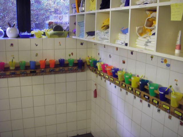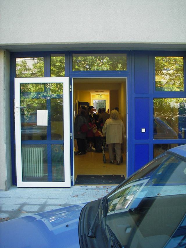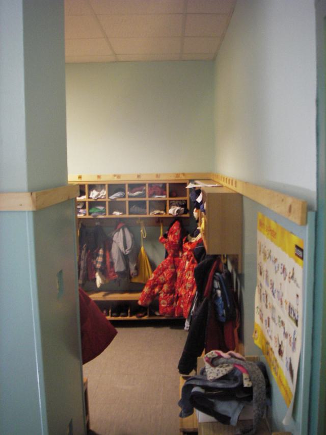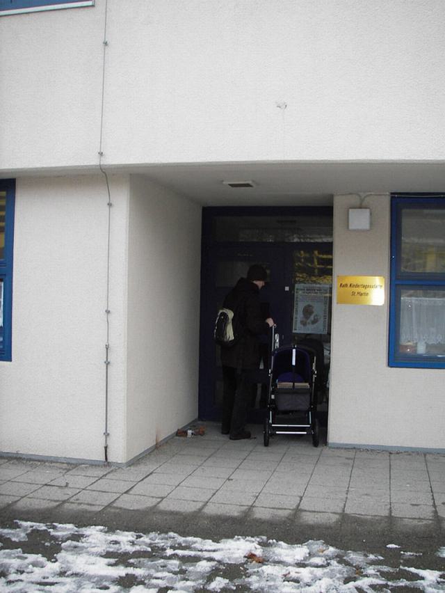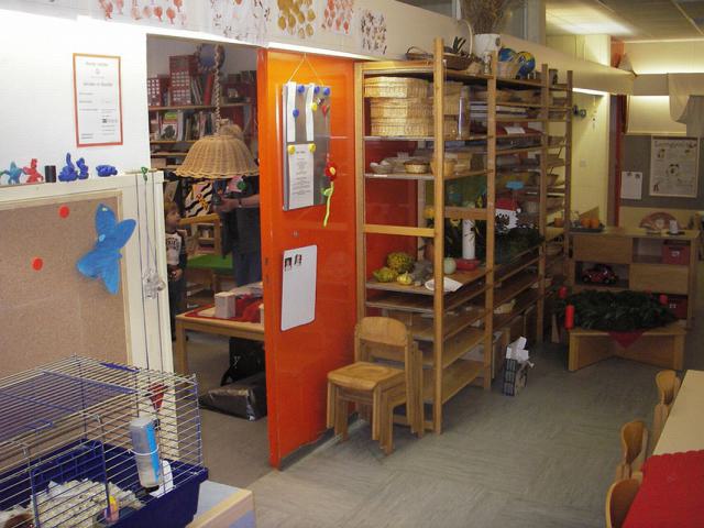 Vor allem die Eingangs- und Garderobensituation wurden verändert, so wurde anstelle von zwei unscheinbaren Eingängen ein neuer Eingang geschaffen, der die Wahrnehmbarkeit der Kita deutlich erhöht, außerdem erhielt die Kita einen eigenen Zugang zum Spielplatz, ein behindertengerechtes WC und eine Sauna.